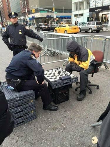 ReplyDeleteI would say the cop, presumably playing white is losing. Either his king is on the run or his queen is surrounded. Hard to tell which one it is in the photo, I would guess the former. Neither is good.